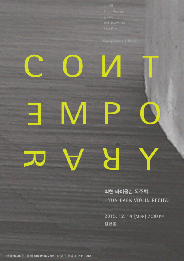 다양한 독주, 실내악 및 현대음악무대에서 왕성하게 활동 중인 바이올리니스트 박현이 기획하고 연주하는 “CONTEMPORARY VIOLIN”은 국내외 현대 바이올린 작품만으로 프로그램을 구성한 연주 시리즈입니다. “현대음악 속에서 바이올린은 어떻게 쓰였는가?” 라는 근본적 질문에서 출발한 이번 기획은 바이올린이라는 고악기를 현대적으로 다룬 음악 속에서 바이올린의 테크닉 및 음색의 새로운 가능성을 찾고자 하였고, 연주자 각자가 미래지향적으로 구축해나가야 할 현대음악의 깊은 해석을 담아내고자 합니다. 1950년대부터 현재에 이르기까지, 유럽과 미국, 일본, 그리고 한국 현대 음악사를 이끌고 있는 작곡가들의 바이올린 작품들을 총 2 회의 연주 시리즈로 나누어 연주 할 예정이며, 첫 번째 시리즈인 이번 공연 에서는 바이올린 솔로, 그리고 바이올린과 피아노를 위해 작곡된 Anton Webern, 김지향, Toru Takemitsu, 강석희, 그리고 Arvo Pärt의 곡을, 피아니스트 히로타 슌지와 함께 연주합니다. 1910년과 2013년 사이에 작곡된 한국, 일본, 유럽의 다양한 현대 바이올린 작품들을 통해 바이올린의 현대적인 음색과 표현을 느낄 수 있는 흥미로운 무대가 될 것입니다.